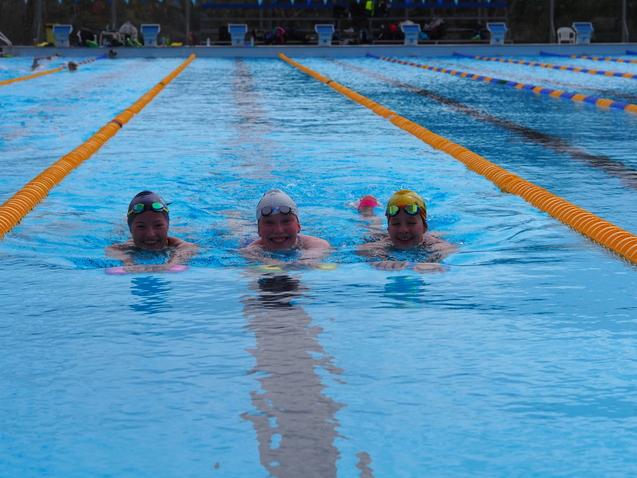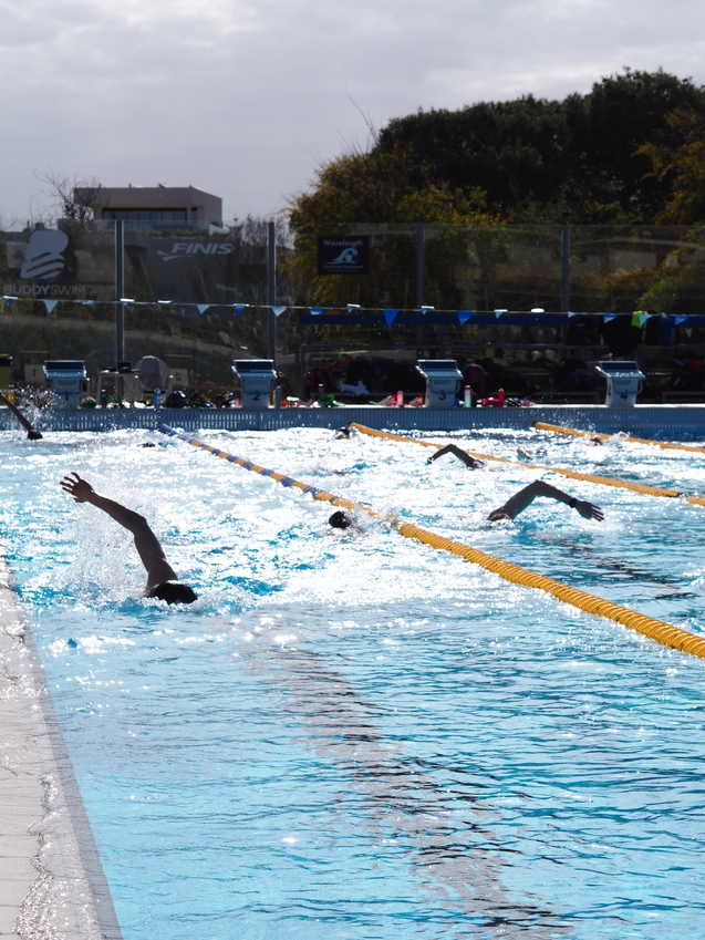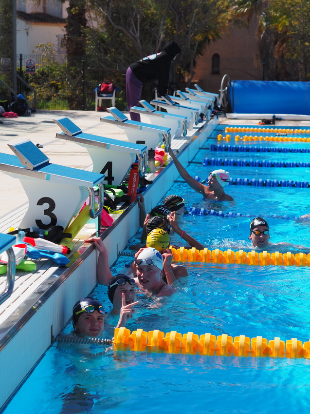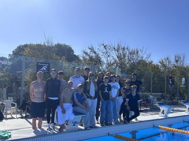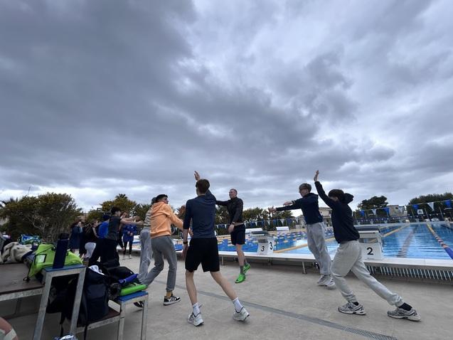 Nach dem Frühstück ging’s schnell aufs Zimmer und dann zum Freibad – etwa 7 Minuten zu Fuß. Heute stand Wettkampfsimulation mit den Nürnbergern an. Vorher haben wir noch Gruppenfotos auf der Startbrücke gemacht, dann sind wir 40 Minuten eingeschwommen. Zum Glück war der Wind heute nicht so schlimm.